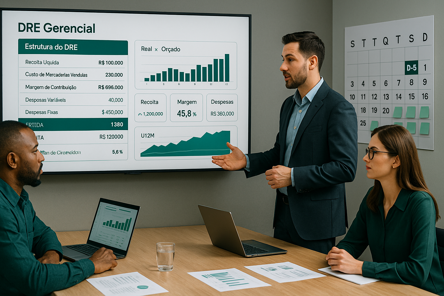Como implementar um DRE gerencial simples e útil em 30 dias: comece pelo básico, respeite a competência, coloque a margem de contribuição no centro, crie ao menos um recorte por centro de resultado e mantenha a cadência D-5. A disciplina transforma números em decisões e protege a margem todos os meses.
